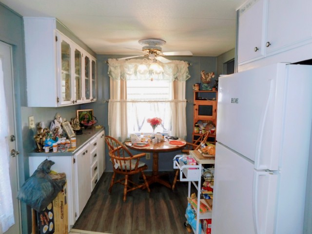 DINING ROOM: Table, two chairs, pine cabinet, cart, lighted ceiling fan