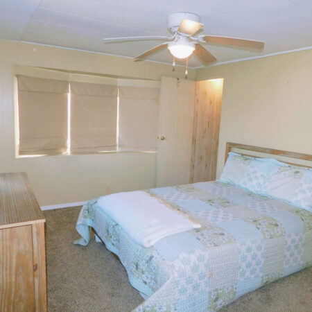 GUEST BEDROOM: Queen bed, TV and stand, dresser with mirror, lighted ceiling fan