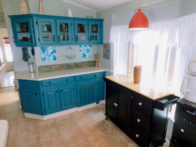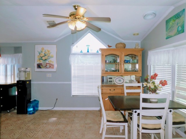 DINING ROOM: Table, four chairs, hutch, lighted ceiling fan