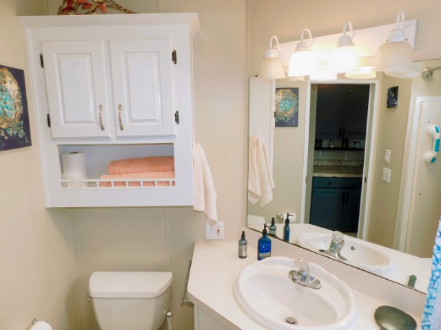 BATHROOMS: Hall bath has combination tub/shower, single vanity, and wall cabinet; guest bath has walk-in shower, single vanity, medicine cabinet, and wall cabinet
