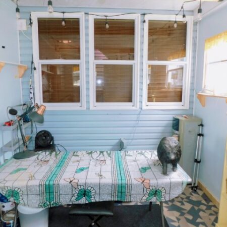 OFFICE/HOBBY ROOM: Shelving, window A/C unit
