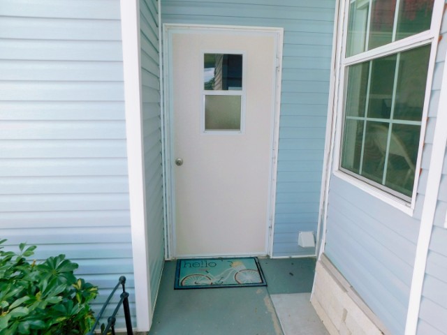 EXTERIOR: Blue vinyl siding with white trim, rubber roof-over, double wide carport and driveway, 9×12 attached storage shed
