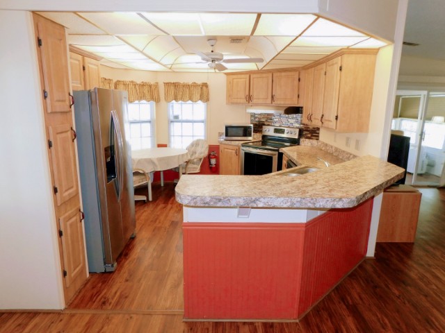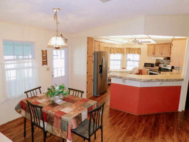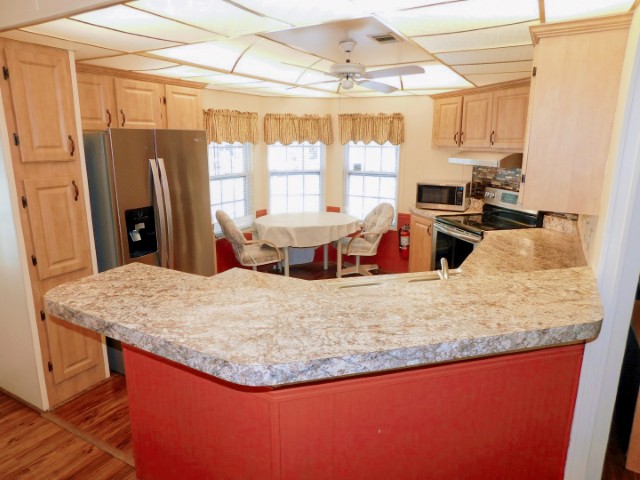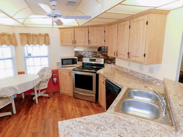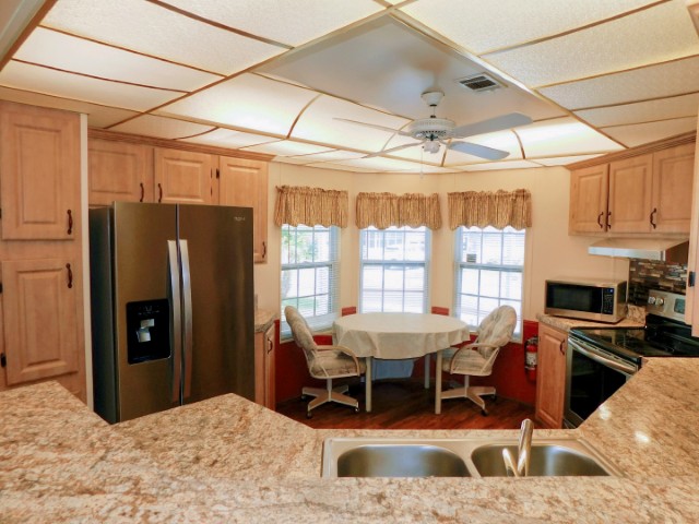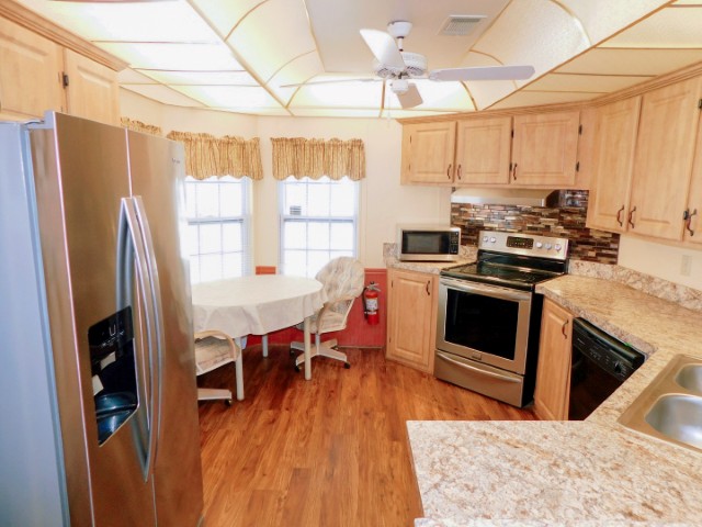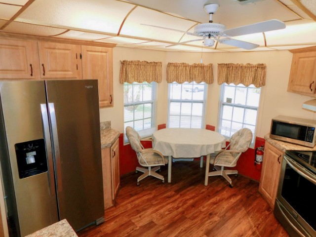 KITCHEN: Whirlpool refrigerator, Frigidaire range and dishwasher, Sharp microwave, table, two chairs, ceiling fan