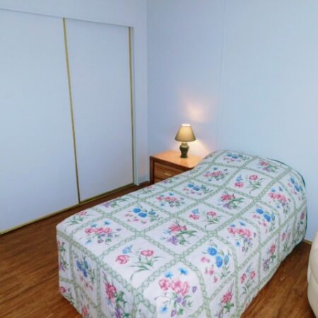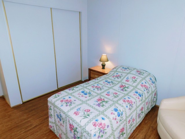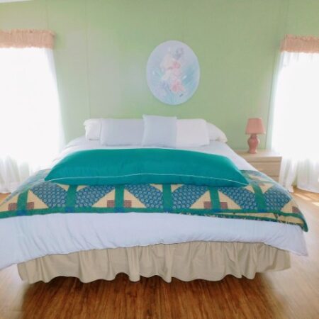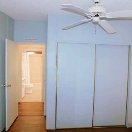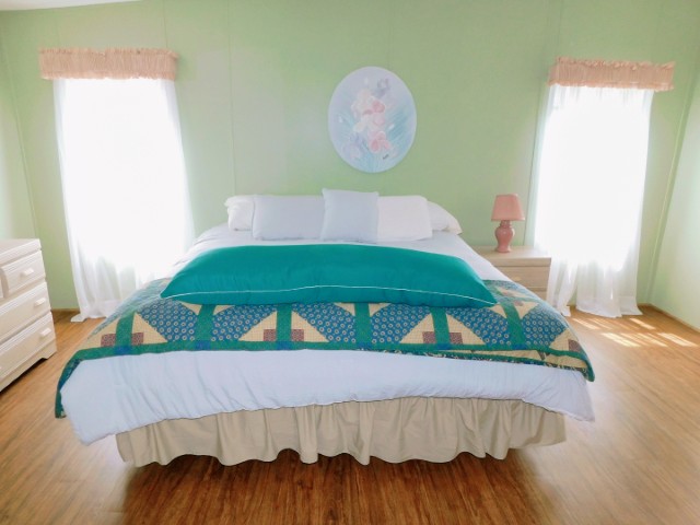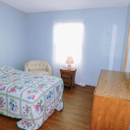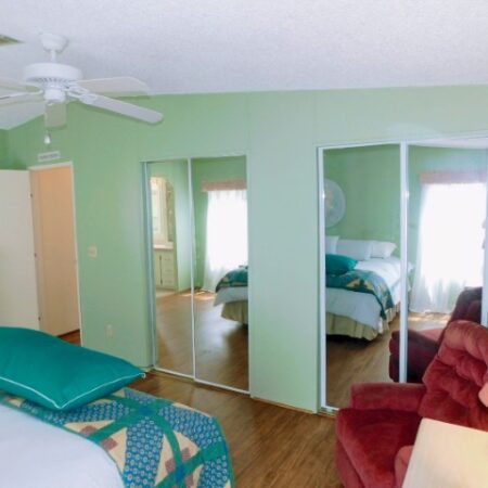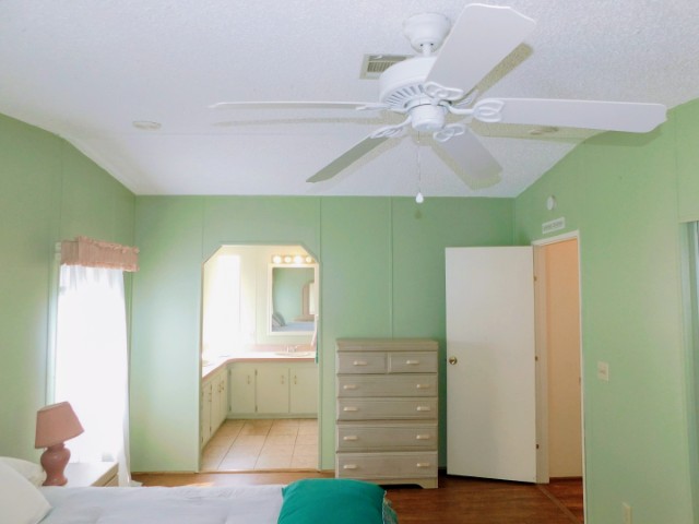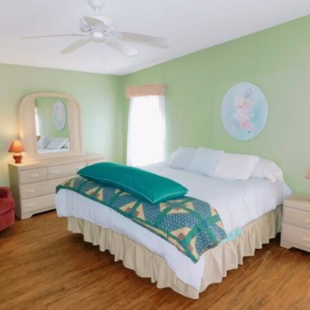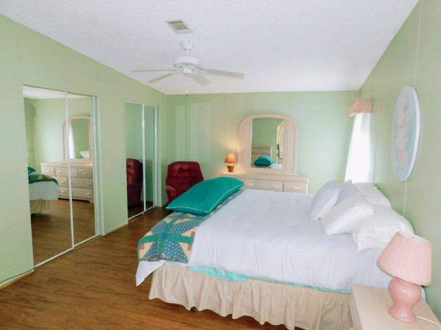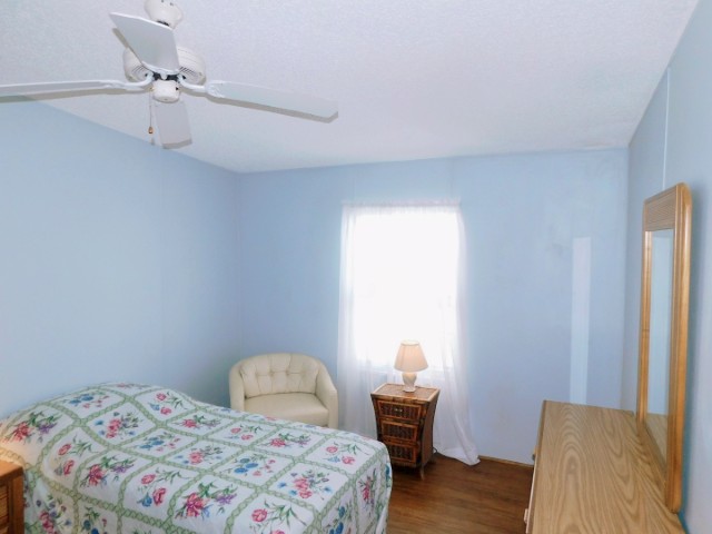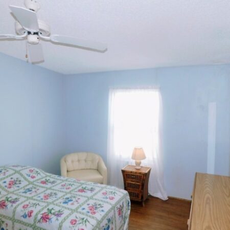 GUEST BEDROOM: Twin bed, chair, dresser with mirror, two nightstands, two table lamps, ceiling fan