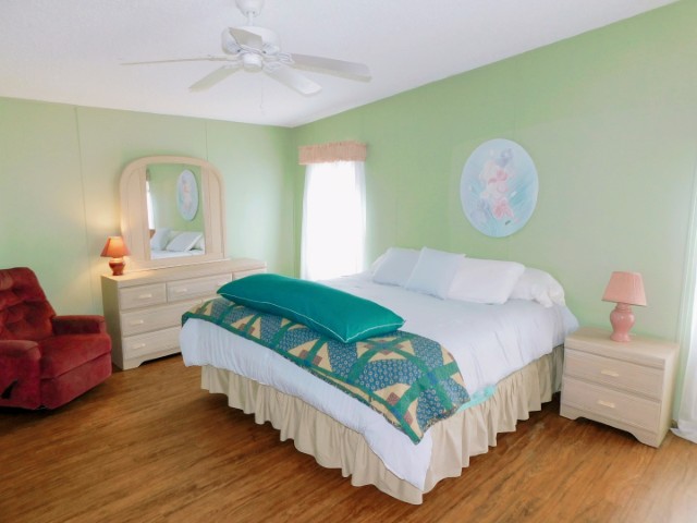 MASTER BEDROOM: King bed, recliner, dresser with mirror, chest of drawers, nightstand, two table lamps, TV, ceiling fan