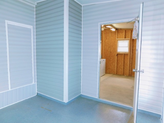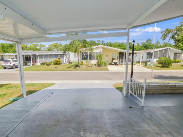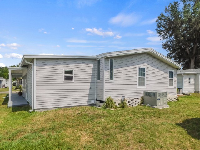EXTERIOR: Gray vinyl siding with white trim, asphalt shingle roof, extra wide driveway and carport, 11×12 attached storage shed with laundry, entry door from covered front patio into Florida room