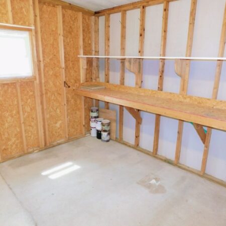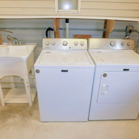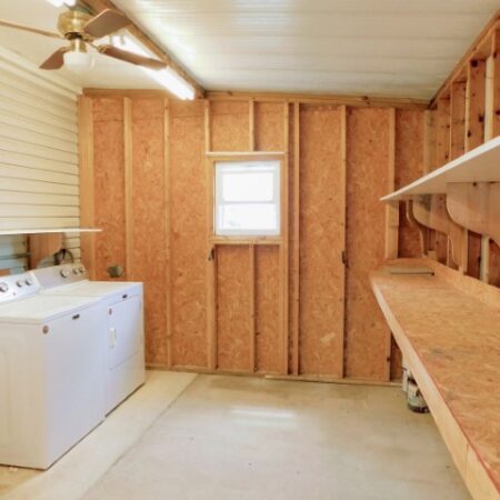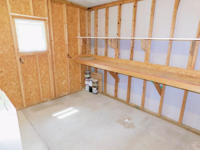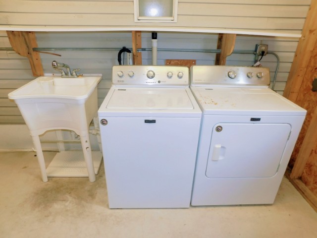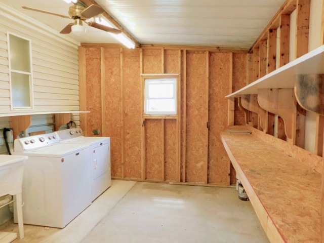 STORAGE SHED/LAUNDRY ROOM: Maytag washer and dryer, work bench, shelving, lighted ceiling fan