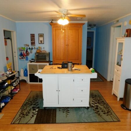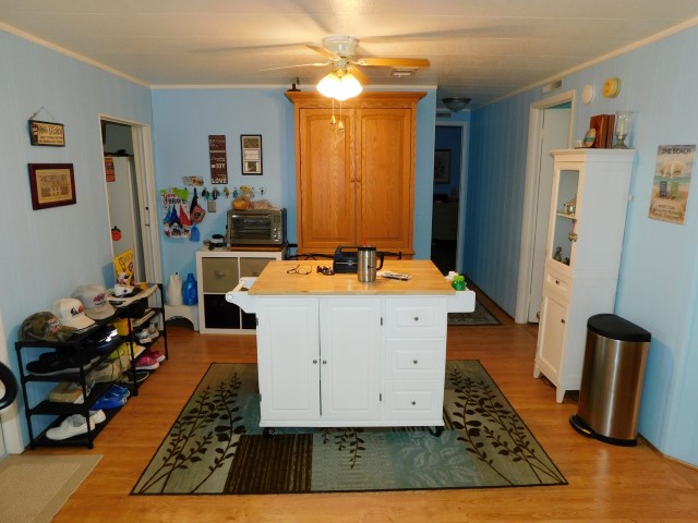 BREAKFAST NOOK: Rolling island, two tall storage cabinets, lighted ceiling fan