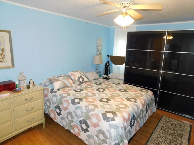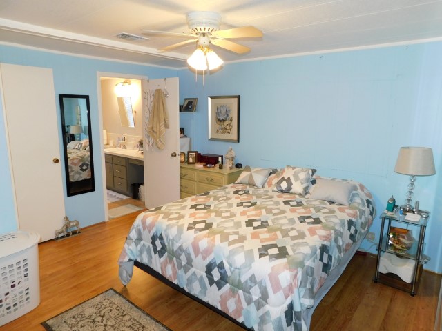 MASTER BEDROOM: Queen bed, dresser, nightstand, table lamp, lighted ceiling fan