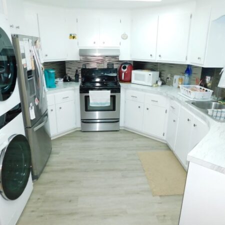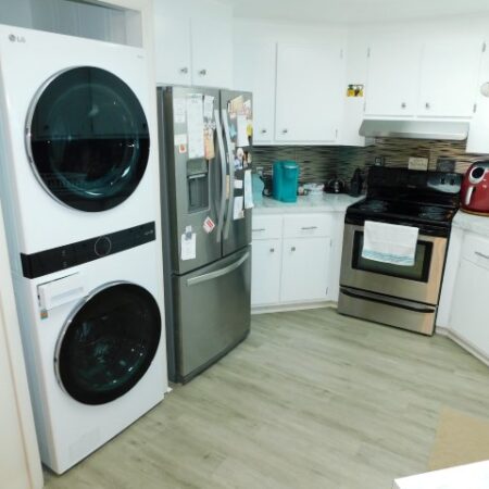 KITCHEN/LAUNDRY ROOM: Whirlpool refrigerator, Frigidaire range, LG dishwasher, GE microwave, one piece LG washer and dryer set