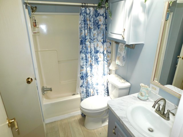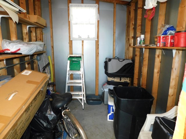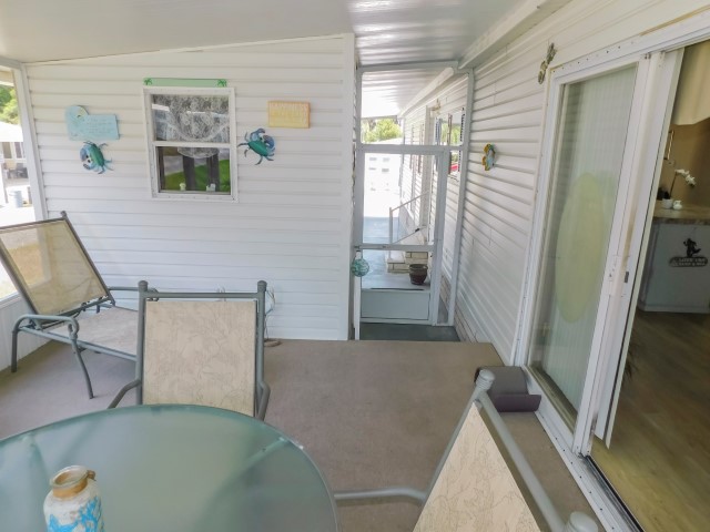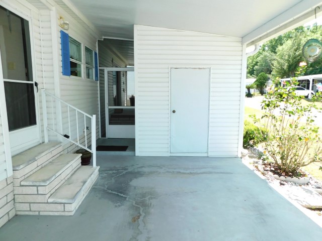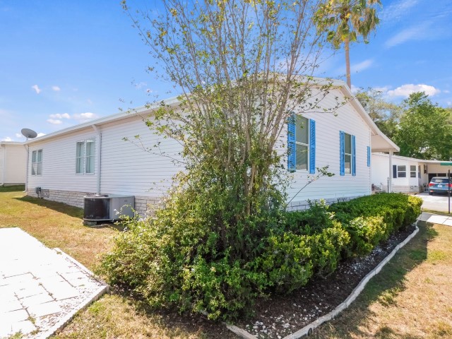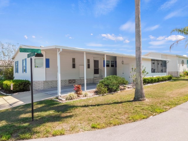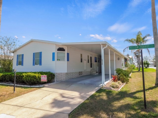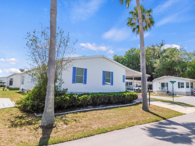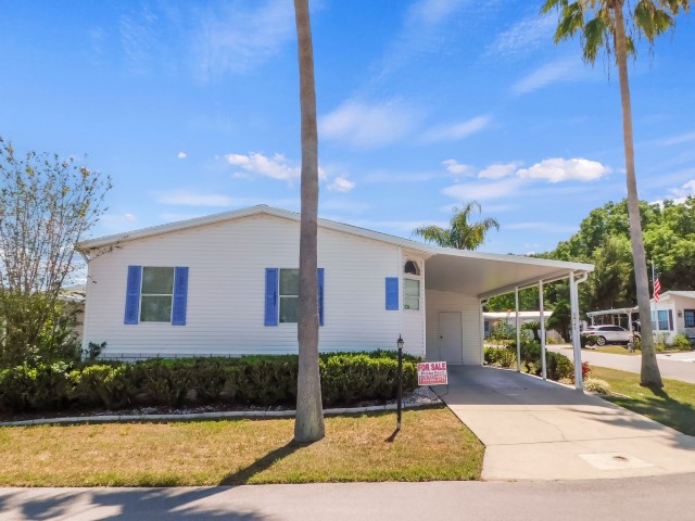 EXTERIOR: White vinyl siding, asphalt shingle roof, carport, 8×9 attached storage shed, corner lot location close to community entrance and amenities