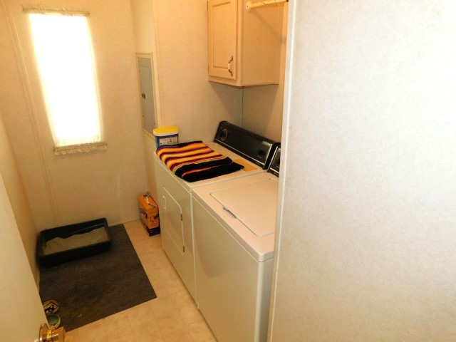 INTERIOR: Central A/C, two ceiling fans, center island with seating in kitchen, upper cabinets in laundry room, privacy door between guest bedroom and bathroom, window treatments throughout