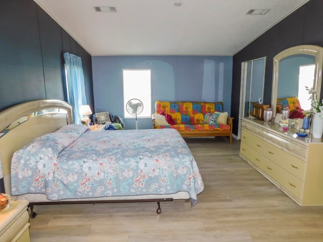 MASTER BEDROOM: Queen bed, futon, dresser with mirror, two night stands, two table lamps