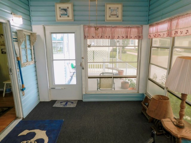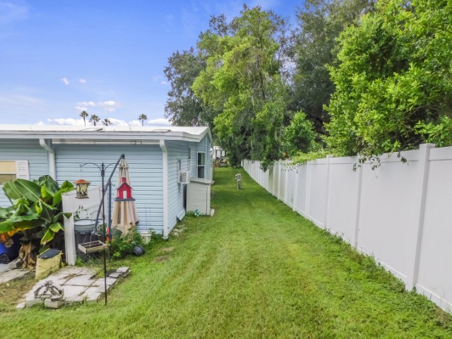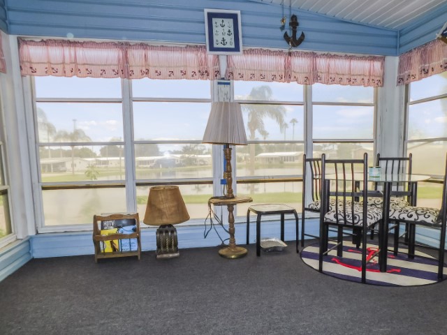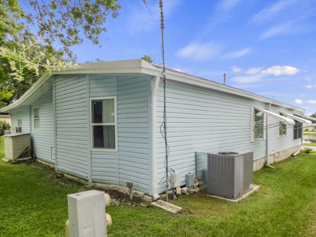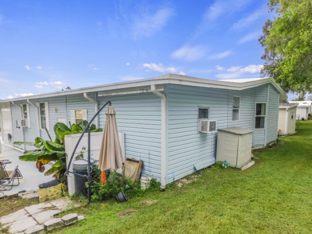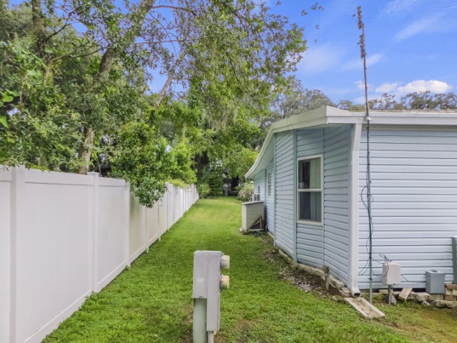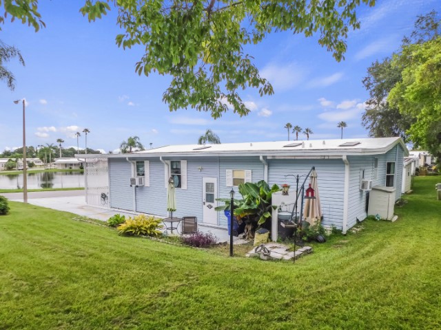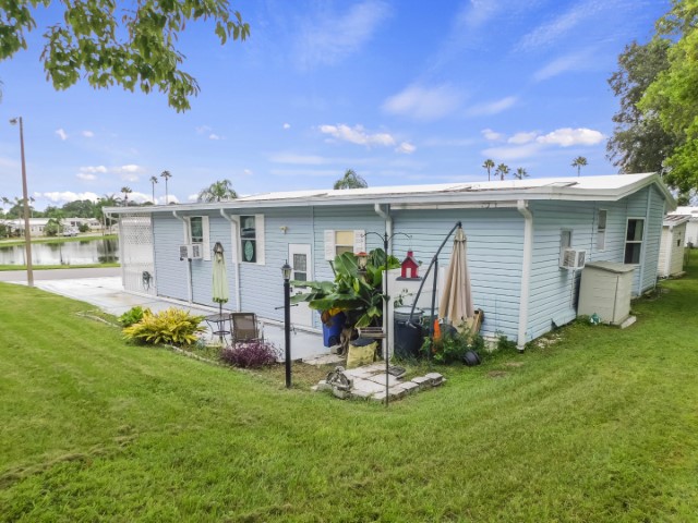 EXTERIOR: Blue vinyl siding with white trim, newer (2018) rubber roof-over, 12×27 attached garage, 12×17 attached workshop, 8×10 raised front porch beside Florida room with spectacular water view, wide sidewalk from driveway to workshop, perimeter lot with private back yard, lot location close to community entrance, clubhouse, pool, and amenities