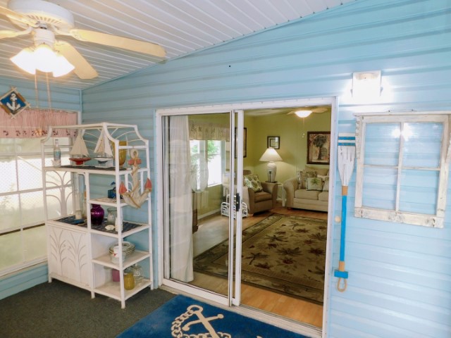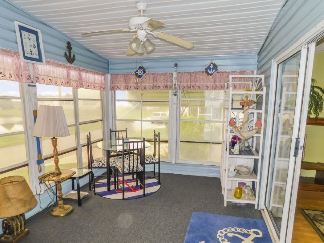 FLORIDA ROOM: Table, four chairs, TV stand, lighted ceiling fan