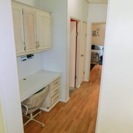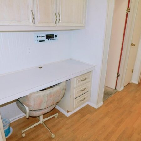 HALLWAY: Built-in desk, upper cabinets, and linen closet