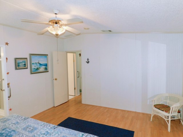 MASTER BEDROOM: King bed, chair, two nightstands, lighted ceiling fan